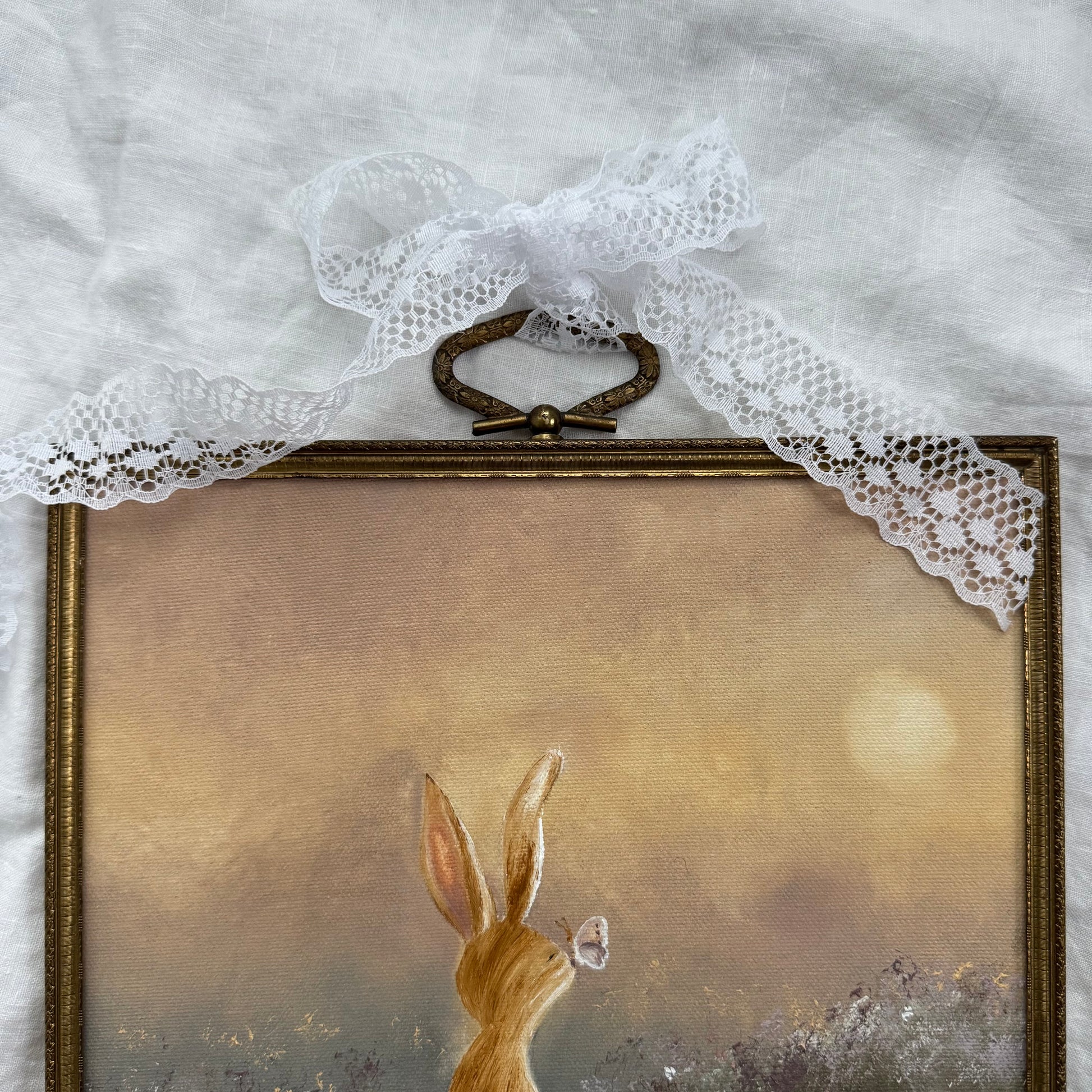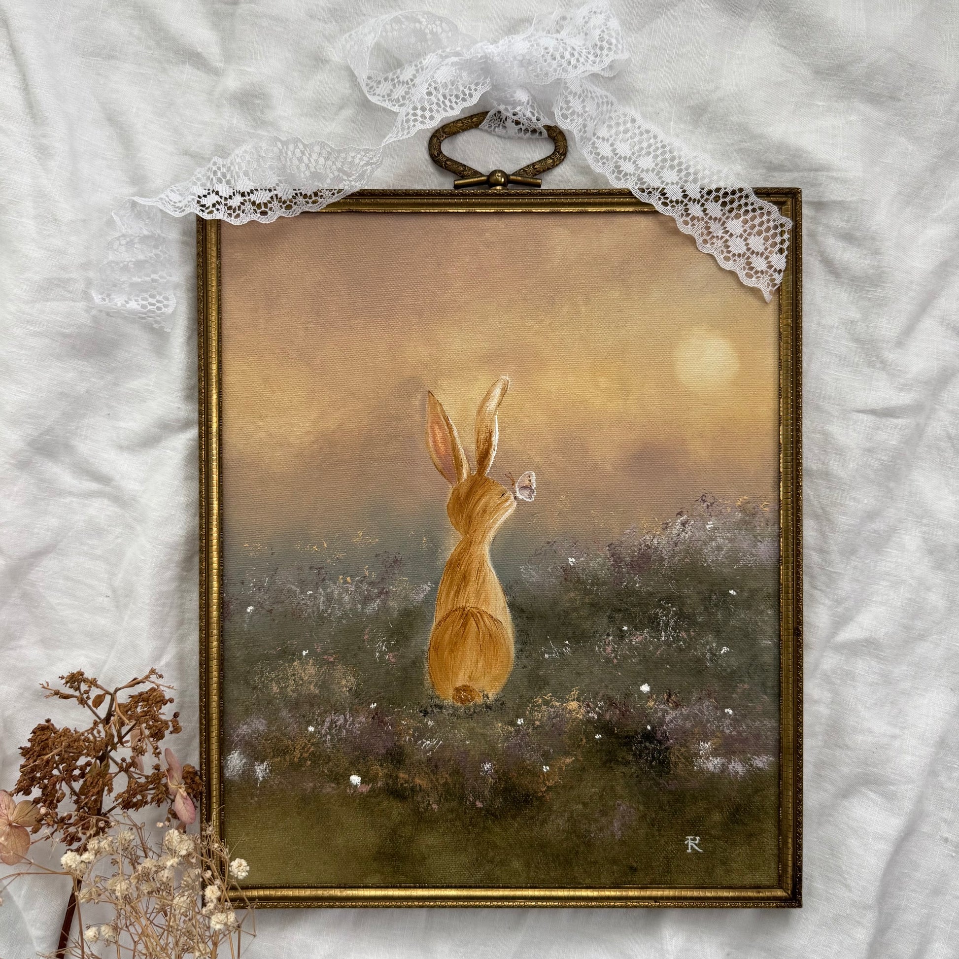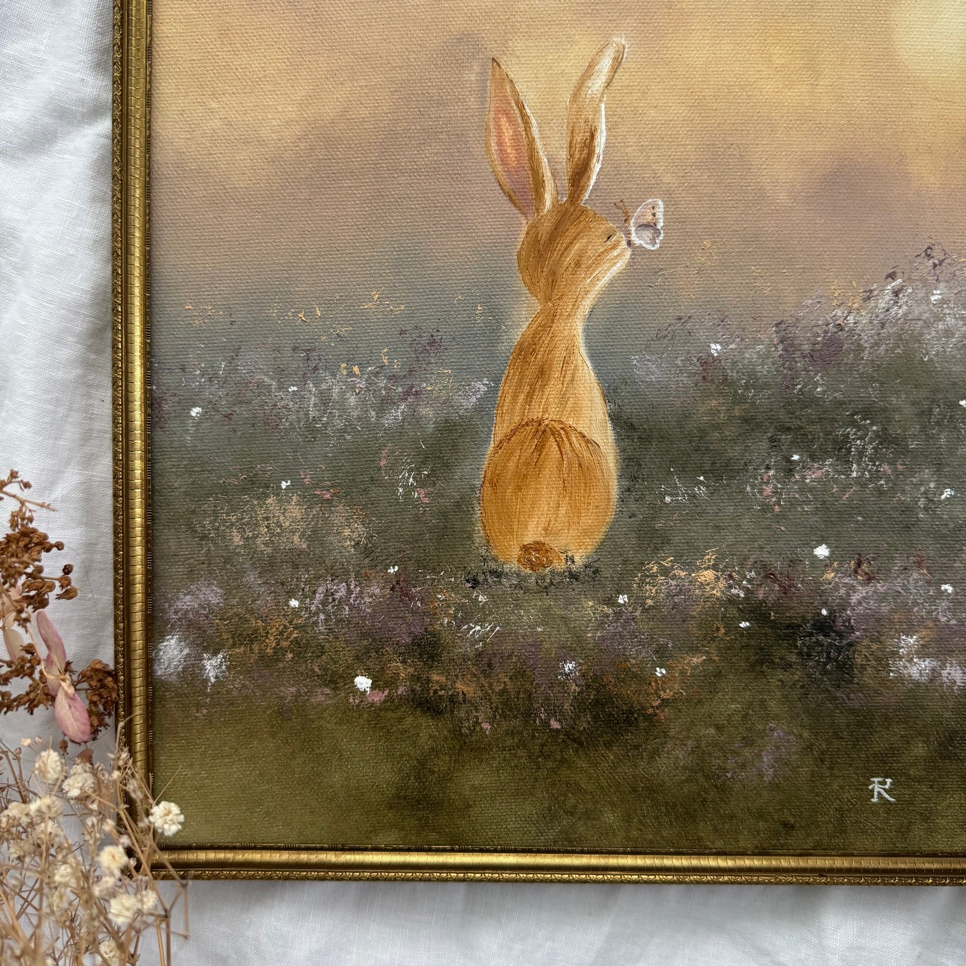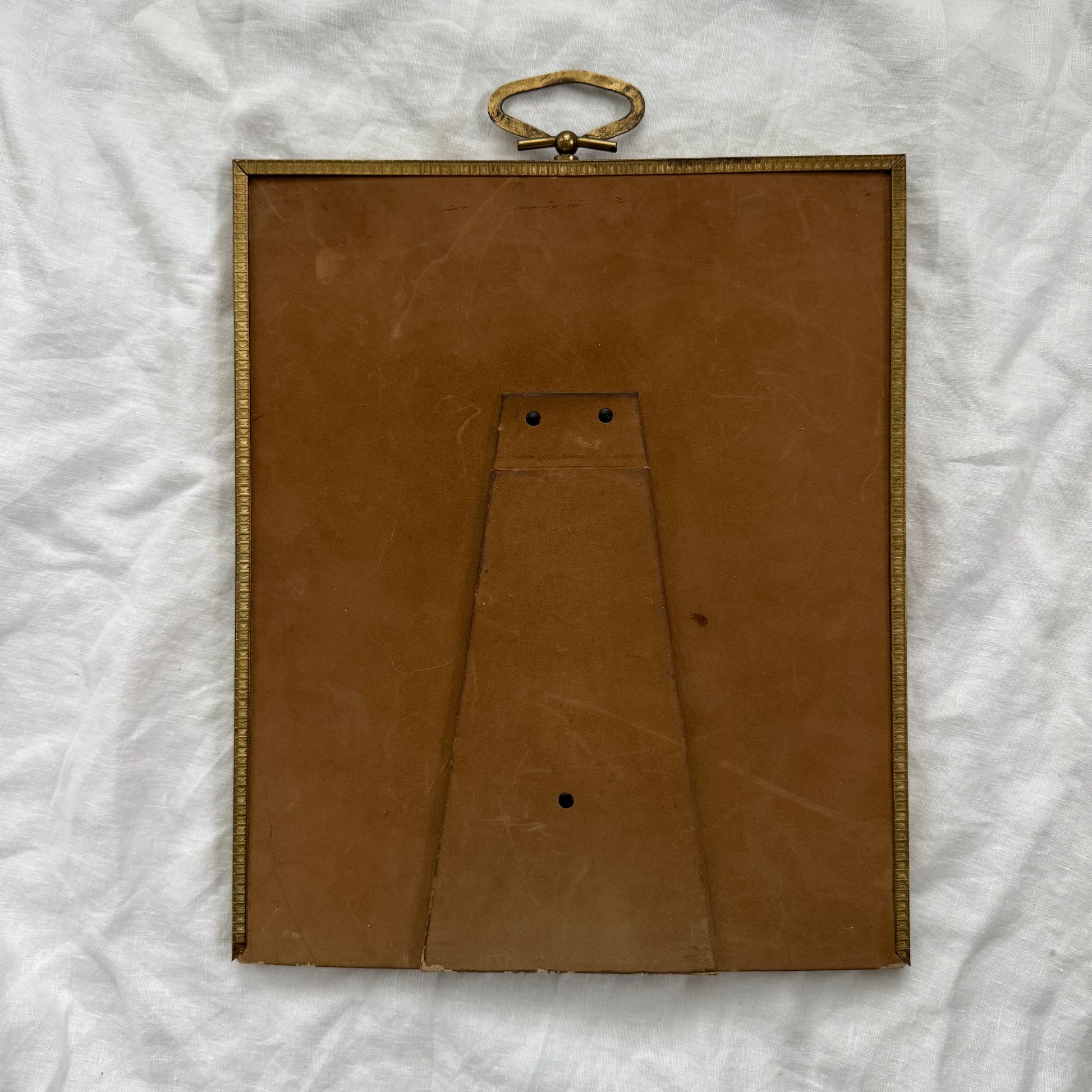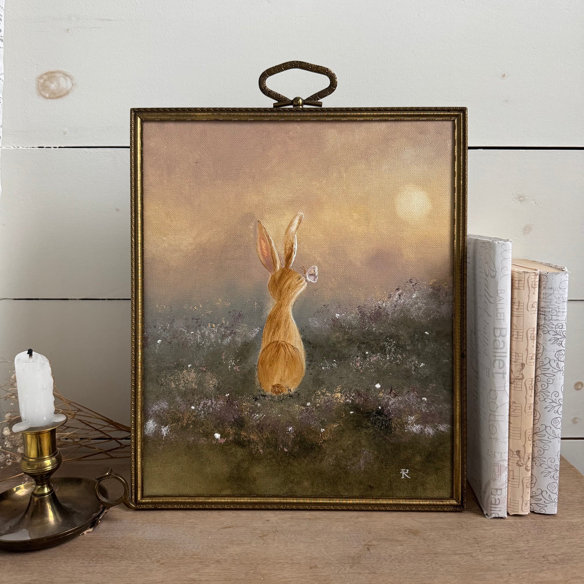 Oil painting on cotton canvas, framed in a beautiful antique brass frame. The frame is unglazed and can be hung using its original metal hanging ring integrated into the frame, or simply placed on a surface (see photos!).